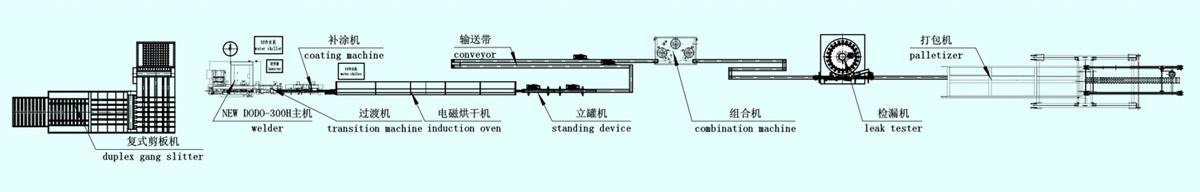 قطع الصفائح المعدنية – نقل حزمة جسم العلبة – الحام الدائري – طلاء وصلات اللحام – التجفيف – تشكيل الدوسرة، تشكيل الشفة، التحزيز، الربط بالثني – اختبار التسرب – الفحص البصري – التحميل على بليتات، االربط والتحزيم